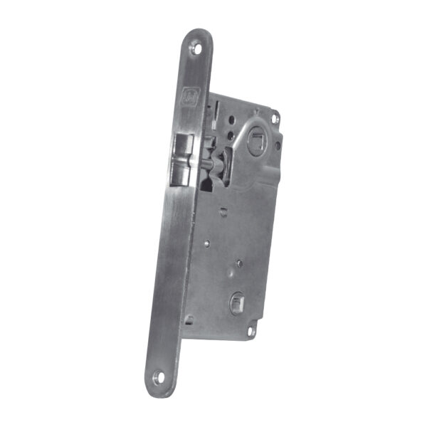 Cerradura para Pasillos, embutida, simple paso (sin llave).Backset de 50mm. Balancín regulador de picaporte derecho/izquierdo. Frontal y contrafrontal terminación canto redondo. Acabado niquel satinado. Caja de cerradura acero zincado y remachado.